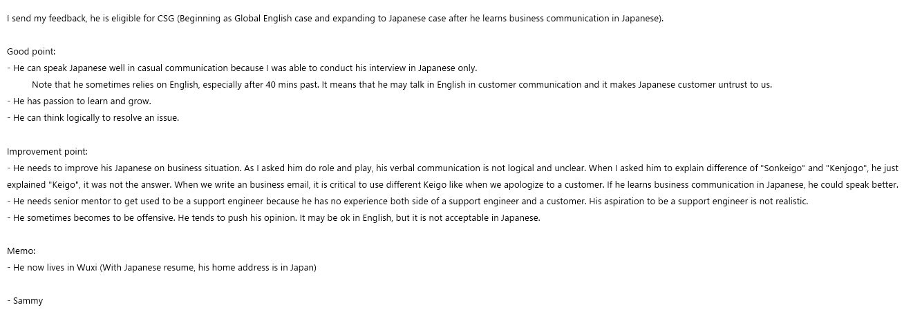 另外我的英语写作能力和口语能力提升都很明显,更重要的是敢于开口。之前在日本使用英语的机会还是比较少,而且通常是有提前准备的发表,这几个月和客户交流确实提升了很多。